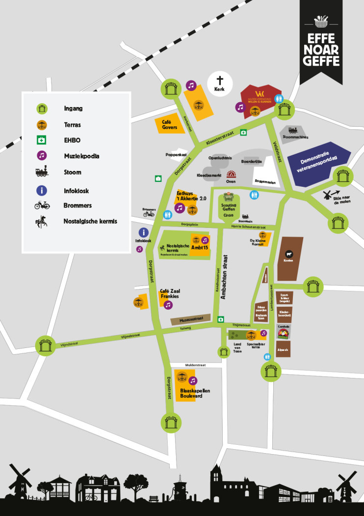 Op de onderstaande plattegrond zie je het volledige parcours van Effe noar Geffe 2025: