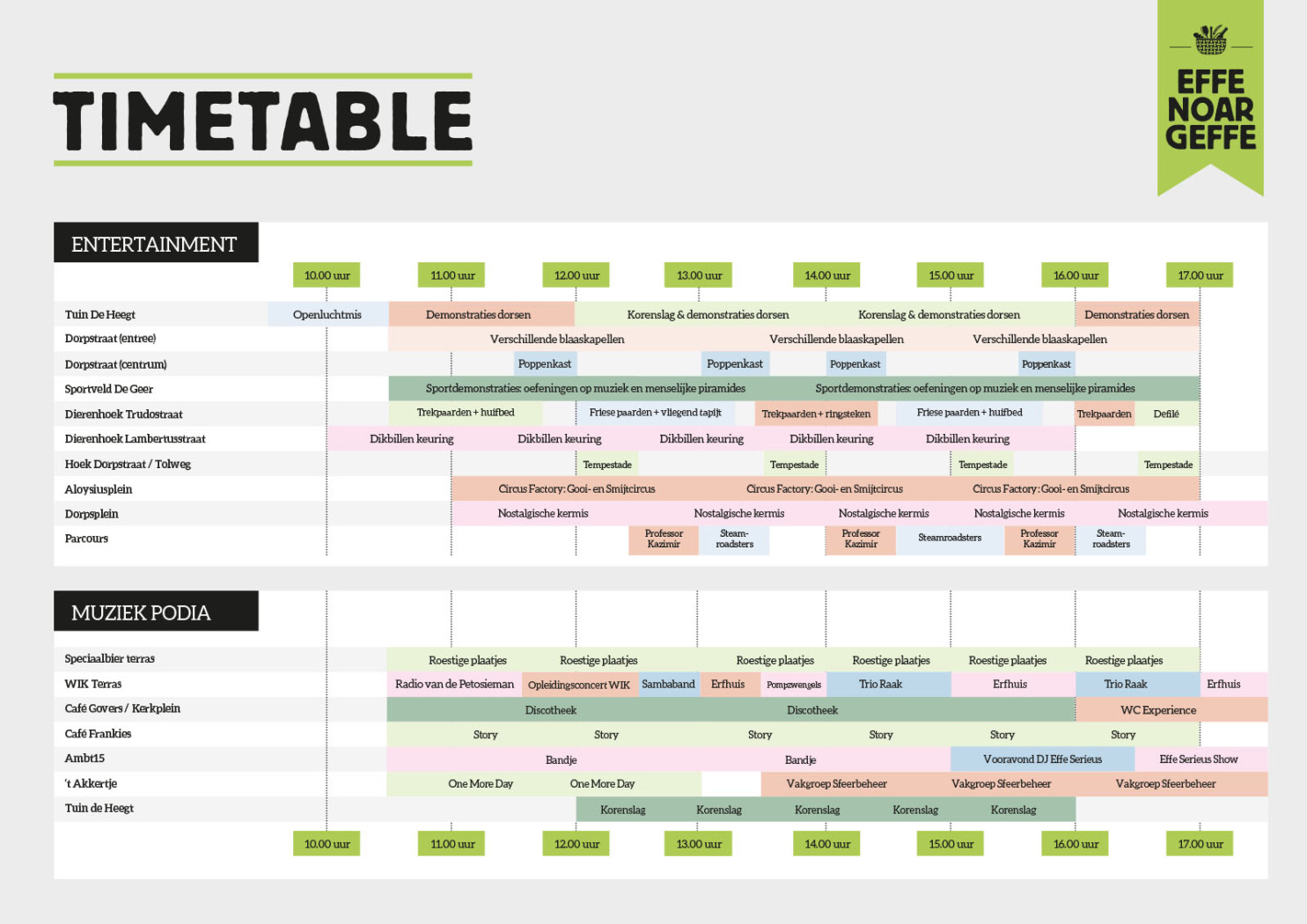 In de timetable van Effe noar Geffe kun je precies zien hoe laat de verschillende demonstraties beginnen. Ook de begin- en eindtijden van het complete muziekprogramma vind je hierin terug. Zo hoef je deze editie dus niets te missen!